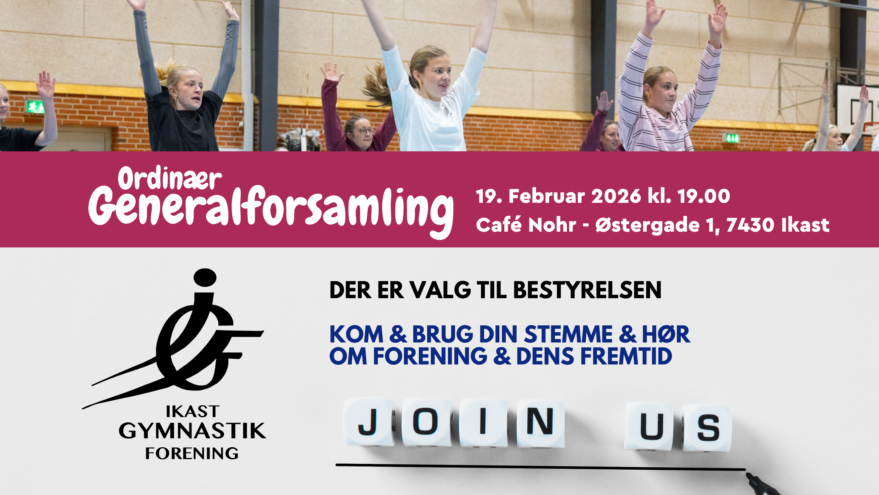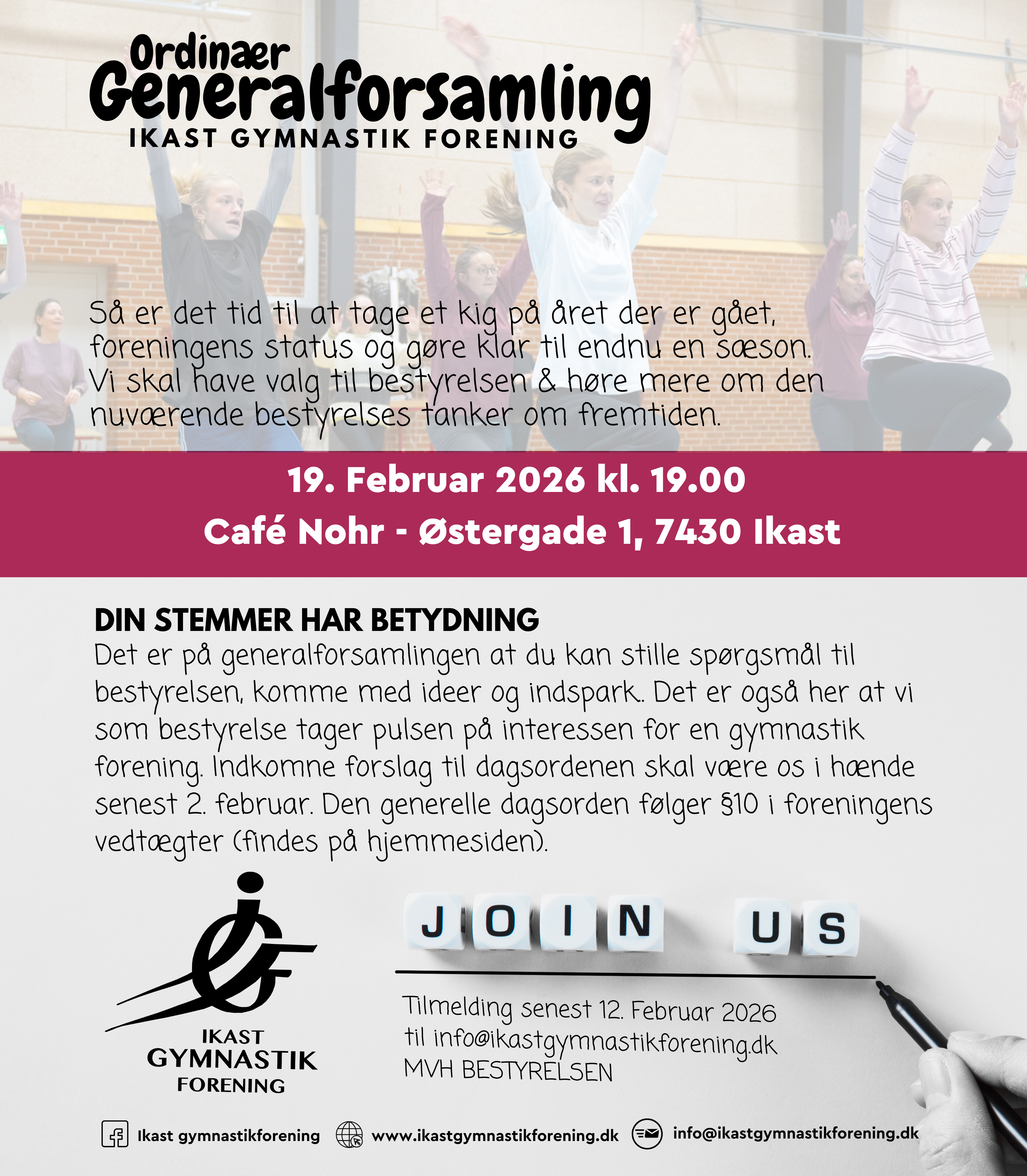 TILMELDING TIL GENERALFORSAMLINGEN SKAL SKE SENEST 12. FEBRUAR VIA HOLDSPORT KALENDER eller på MAIL info@ikastgymnastikforening.dk
